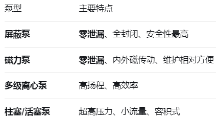 有毒和易燃易爆:安全性是首要的。因此,零泄漏的屏蔽泵和磁力泵成為主要選擇。即使使用有機封的離心泵或柱塞泵,也須配備高等級的密封系統。